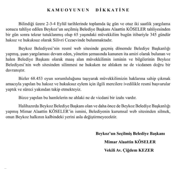 06.02.2026- Uzun bir süredir tutuklu yargılanan Beykoz Belediye Başkanı Alaattin Köseler Vekili Avukat Çiğdem Kezer aracılığı ile kamuoyuna Beykoz Belediyesi resmi internet sitesinden adının silinmesine ilişkin bir açıklama yayınladı.
