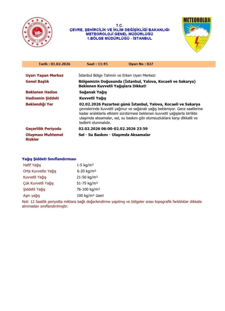 01.02.2026- Beykoz Kaymakamlığı meteorolojiden gelen veriler üzerine 2 Şubat Pazartesi günü yoğun yağmur ve olası su baskınlarına ilişkin vatandaşları uyardı.