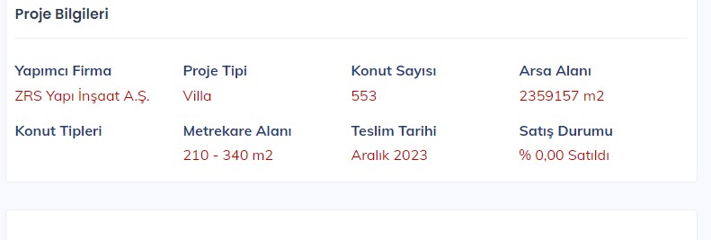 ZRS Yapı İnşaat A.Ş.’nın Beykoz’da 2 milyon 359 bin 157 metrekarelik arsa üzerine kurulan yeni projesinde 553 villa yer alıyor. Projedeki villaların oturum alanı 210, 250 ve 340 metrekare olarak açıklandı. 398 milyon 358 bin TL yatırım değerine sahip olan projenin inşaat alanı 286 bin 714 metrekare olarak belirlendi.