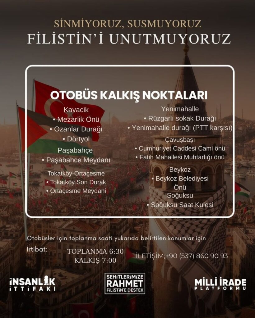 30.12.2025- Gazze’ye yeniden dikkatleri çekmek üzere Milli İrade Platformu ve İnsanlık İttifakı öncülüğünde organize edilen Gazze’ye destek mitingi 1 Ocak 2026 tarihinde Galata Köprüsü’nde gerçekleştirilecek.