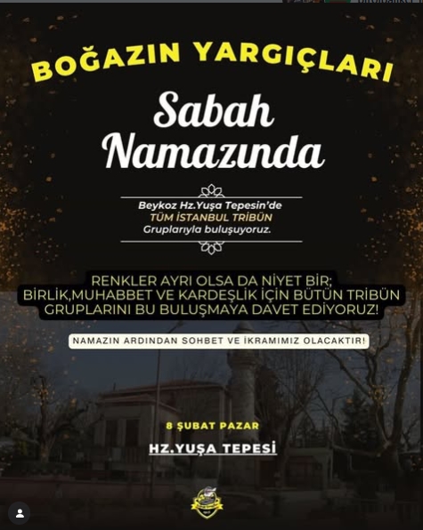 Boğazın Yargıçları taraftar grubu olarak; 8 Şubat Pazar Beykoz Hz. Yuşa Tepesi Sabah Namazı’nda tüm İstanbul tribünleriyle bir araya geliyoruz.