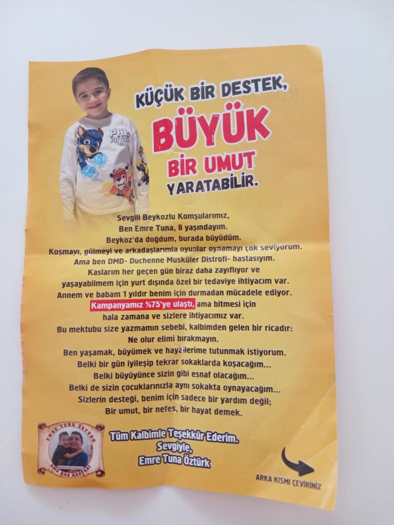 26.12.2025- İçimizden biri Beykoz’un çocuğu 8 yaşındaki Emre Tuna Öztürk, DMD-Duchenne Musküler Distrofi hastalığı ile mücadele ediyor.