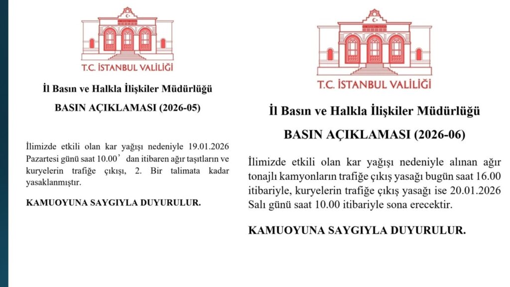 19.01.2026- İstanbul Valiliği etkili olan kar yağışı nedeni ile bugün saat 10:00’dan itibaren ağır taşıtların ve kuryelerin trafiğe çıkışını ikinci bir talimata kadar yasaklandığını açıkladı.