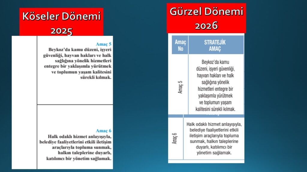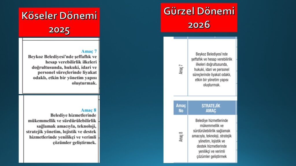 BEYKOZ BELEDİYESİ BAŞKAN VEKİLİ ÖZLEM VURAL GÜRZEL İMZALI AÇIKLANAN PROGRAMDA YER ALAN 8 HEDEF BİR ÖNCEKİ YIL BEYKOZ BELEDİYE BAŞKANI ALAATTİN KÖSELER İMZALI PERFORMANS PROGRAMINDA YER ALAN 8 HEDEF İLE KELİMESİ KELİMESİNE BİRE BİR AYNI ŞEKİLDE ÖRTÜŞTÜ.