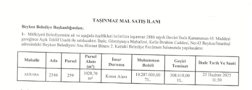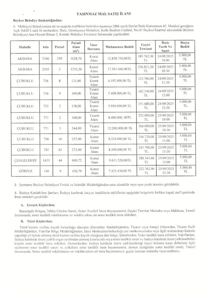 -İstanbul İli, Beykoz İlçesi, Anadoluhisarı Mahallesi, 1006 ada 32 parsel sayılı 1984.02 m2 yüz ölçümlü betonarme iş yeri binası ve arsası nitelikli kat mülkiyetli taşınmazın bağımsız bölümlerinin 2886 sayılı Devlet İhale Kanunu kapsamında satışı hakkındaki Emlak ve İstimlak Müdürlüğünün teklifi. (2025-99257)