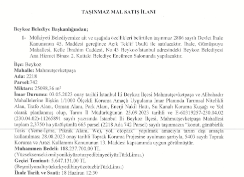 8-İstanbul İli, Beykoz İlçesi, Anadoluhisarı Mahallesi, 1006 ada 32 parsel sayılı 1984.02 m2 yüz ölçümlü betonarme iş yeri binası ve arsası nitelikli kat mülkiyetli taşınmazın bağımsız bölümlerinin 2886 sayılı Devlet İhale Kanunu kapsamında satışı hakkındaki Hukuk Komisyonu Raporu.